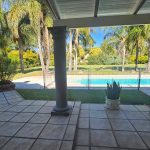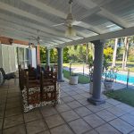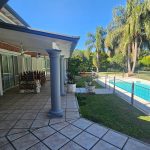 El exterior de la casa es tan impactante como su interior, con una hermosa piscina con solárium que invita a disfrutar del aire libre.