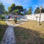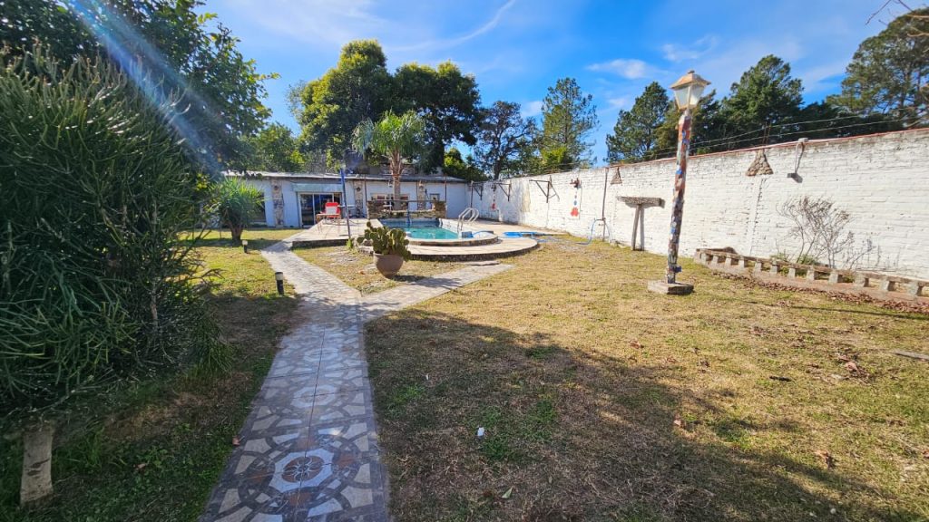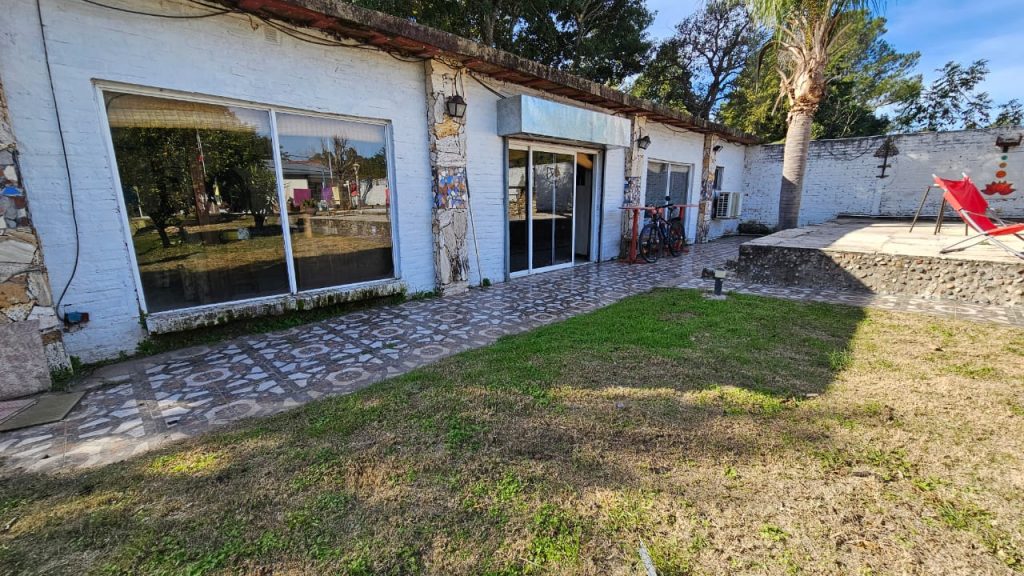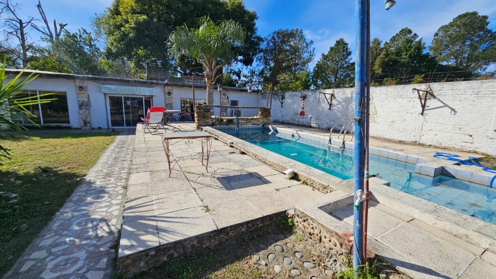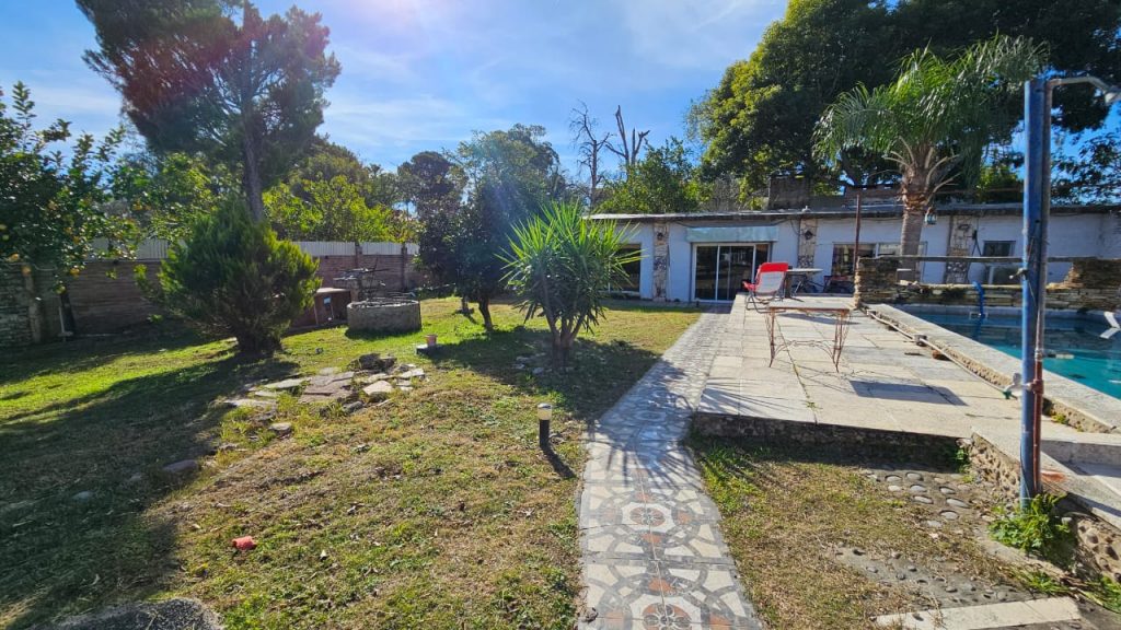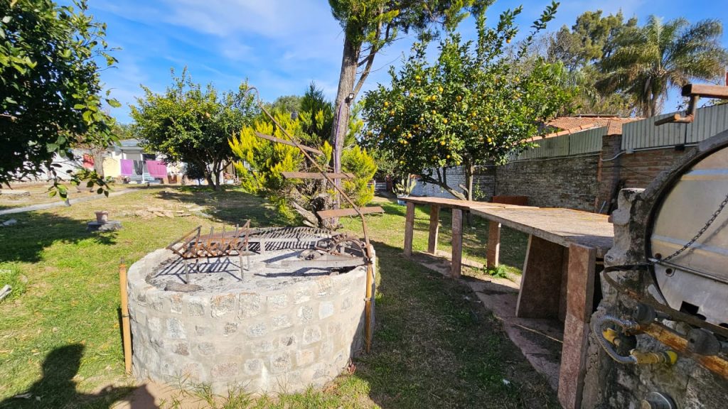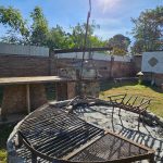 En la parte trasera del terreno se encuentra un quincho completamente equipado, gran asador equipado, una barra, mesada, espacio cómodo para reuniones o eventos y 2 baños adicionales completos, cuarto de guardado. El exterior ofrece un entorno verde encantador, con piscina de material.