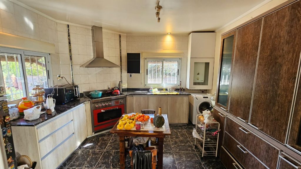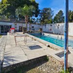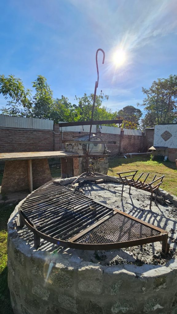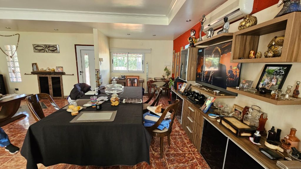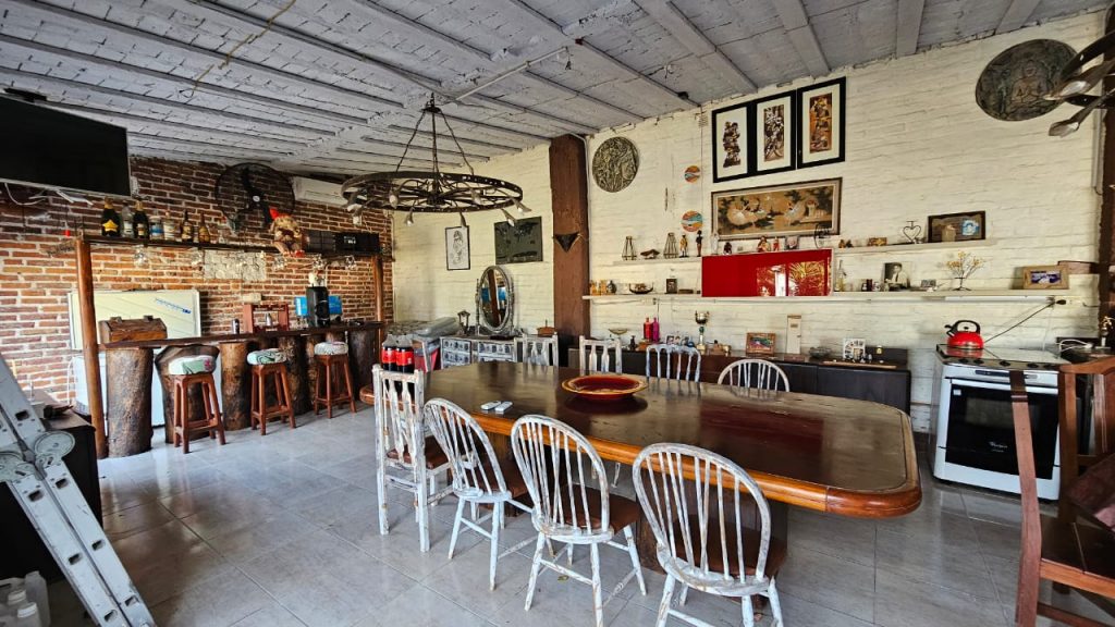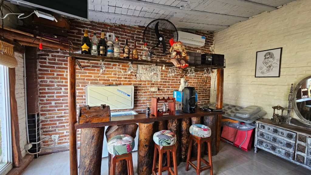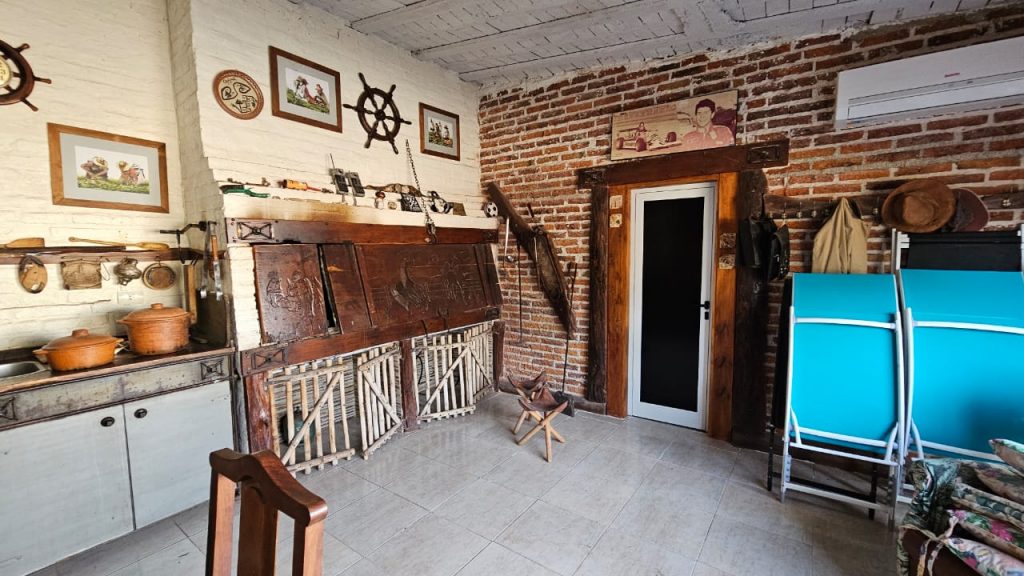 En la parte trasera del terreno se encuentra un quincho completamente equipado, gran asador equipado, una barra, mesada, espacio cómodo para reuniones o eventos y 2 baños adicionales completos, cuarto de guardado. El exterior ofrece un entorno verde encantador, con piscina de material.