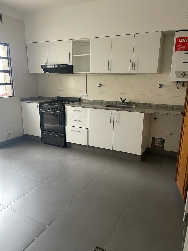 Departamento de tres dormitorios, uno de ellos en suite, living-comedor, cocina, cuatro baños, habitacion de servicio, lavadero cubierto y balcón al frente.